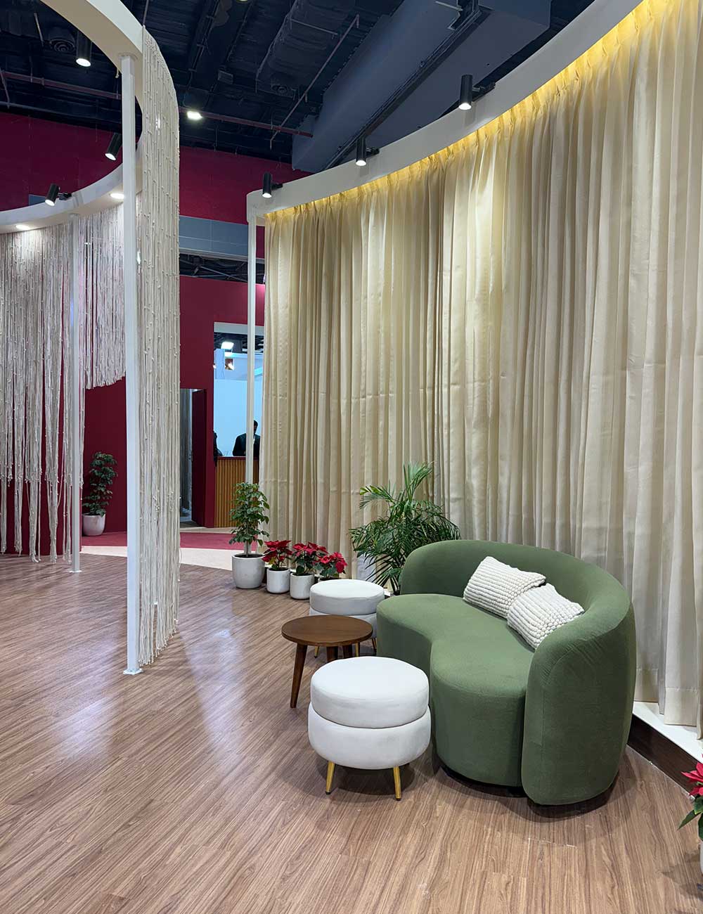 At Bharat Tex 2025, we created more than a stall — we crafted a space that reflected the true essence of fabric. The structure was shaped to follow the natural softness and drape of textiles, with layered surfaces and subtle contours that echoed how garments move and fall.