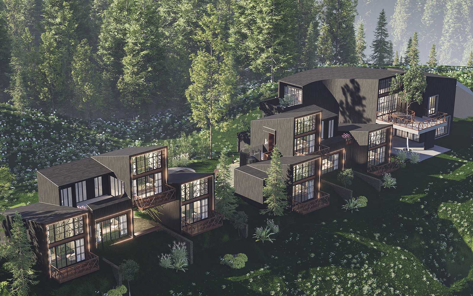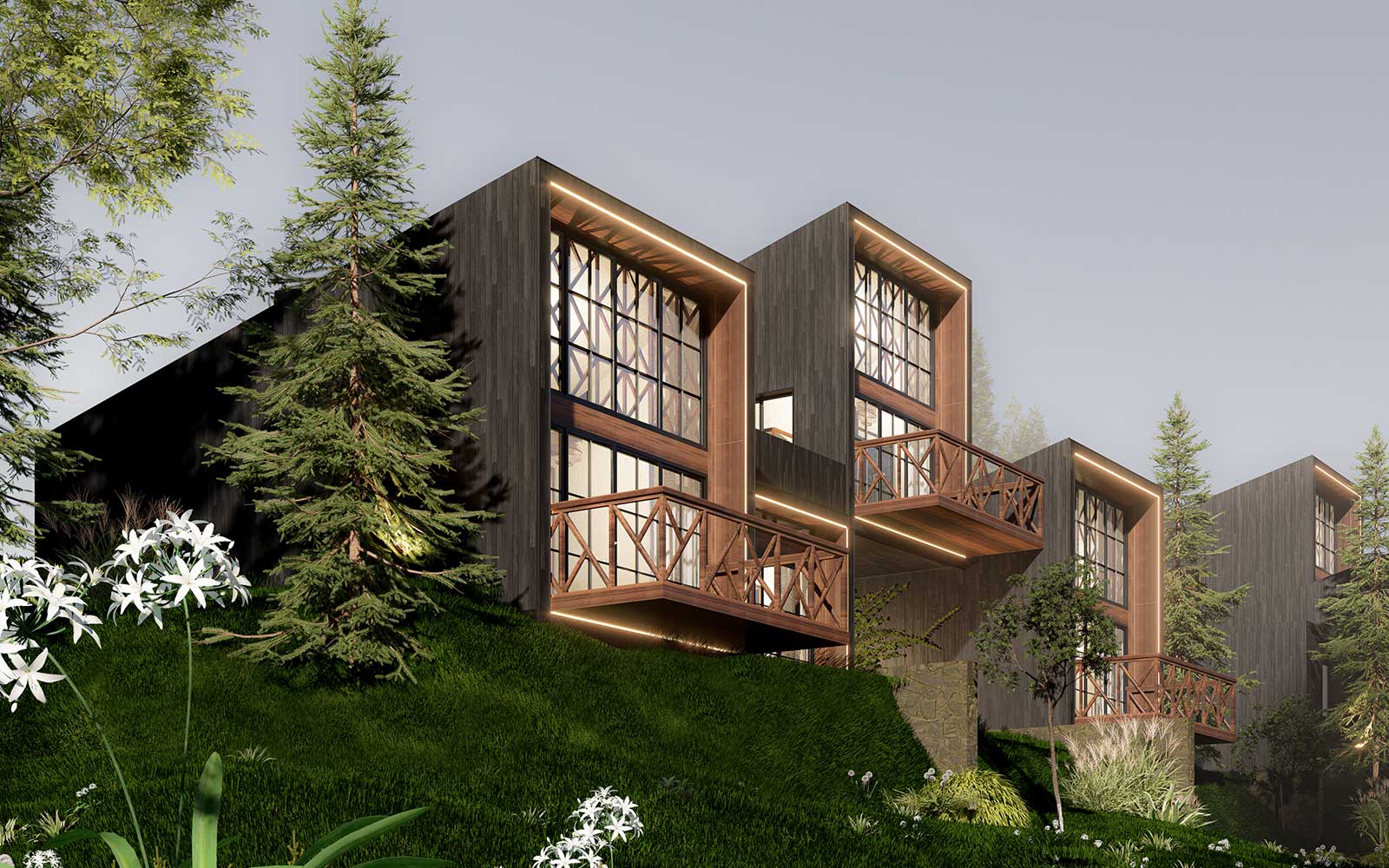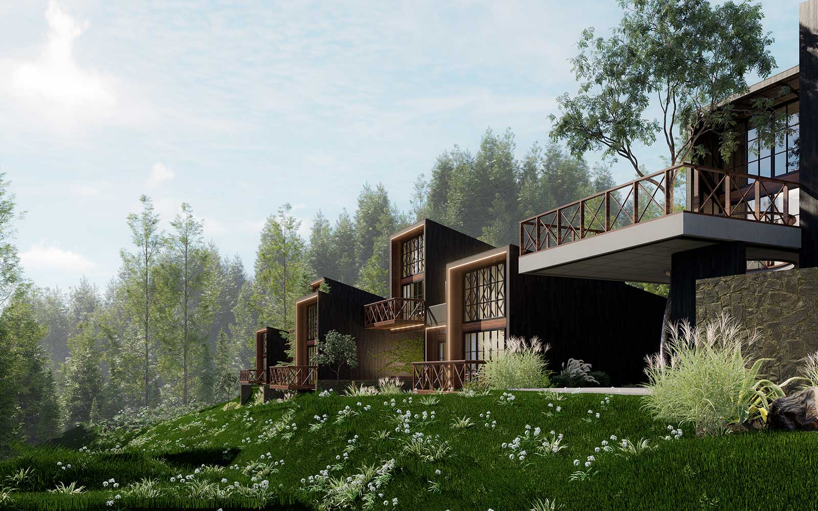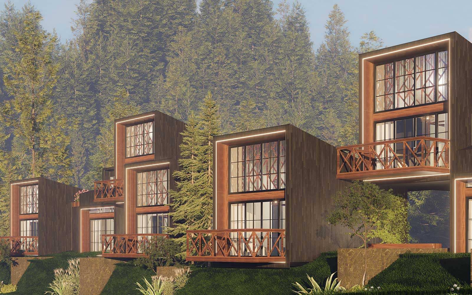 Perched along the natural contours of the hillside, the planning is thoughtfully staggered so every villa unfolds toward uninterrupted views of the Mukteshwar valley. The architecture embraces vertical layering each unit carefully stacked and offset to ensure privacy while maximizing panoramic sightlines. Rooms open into double-height volumes and skylit spaces, allowing daylight to cascade in while framing the sky as an ever-changing canvas. Expansive glazing and intimate balconies extend the interiors outward, dissolving boundaries between the built and the landscape. Every corner is designed to capture light, air, and views transforming each stay into an immersive experience of the valley beyond.