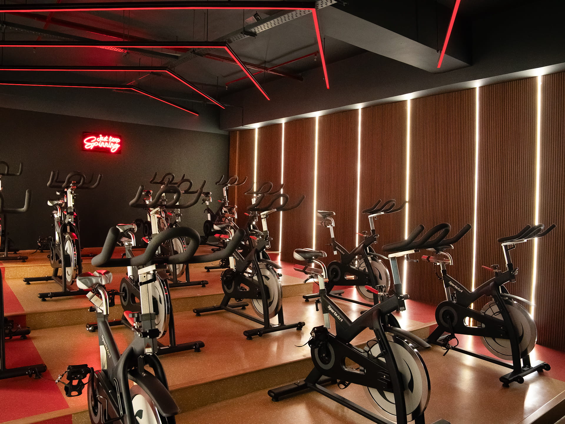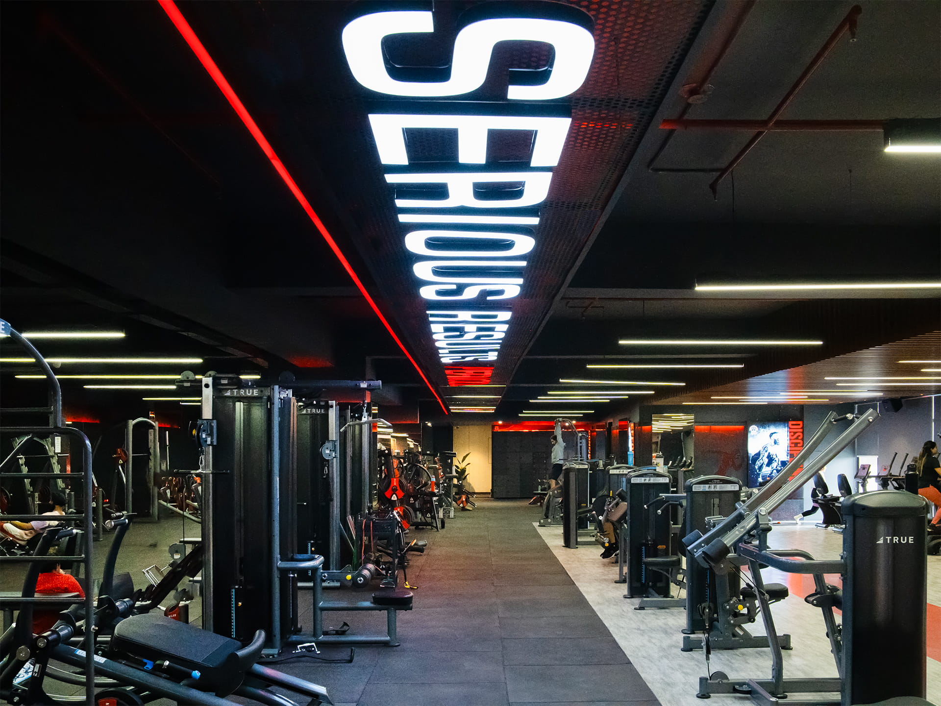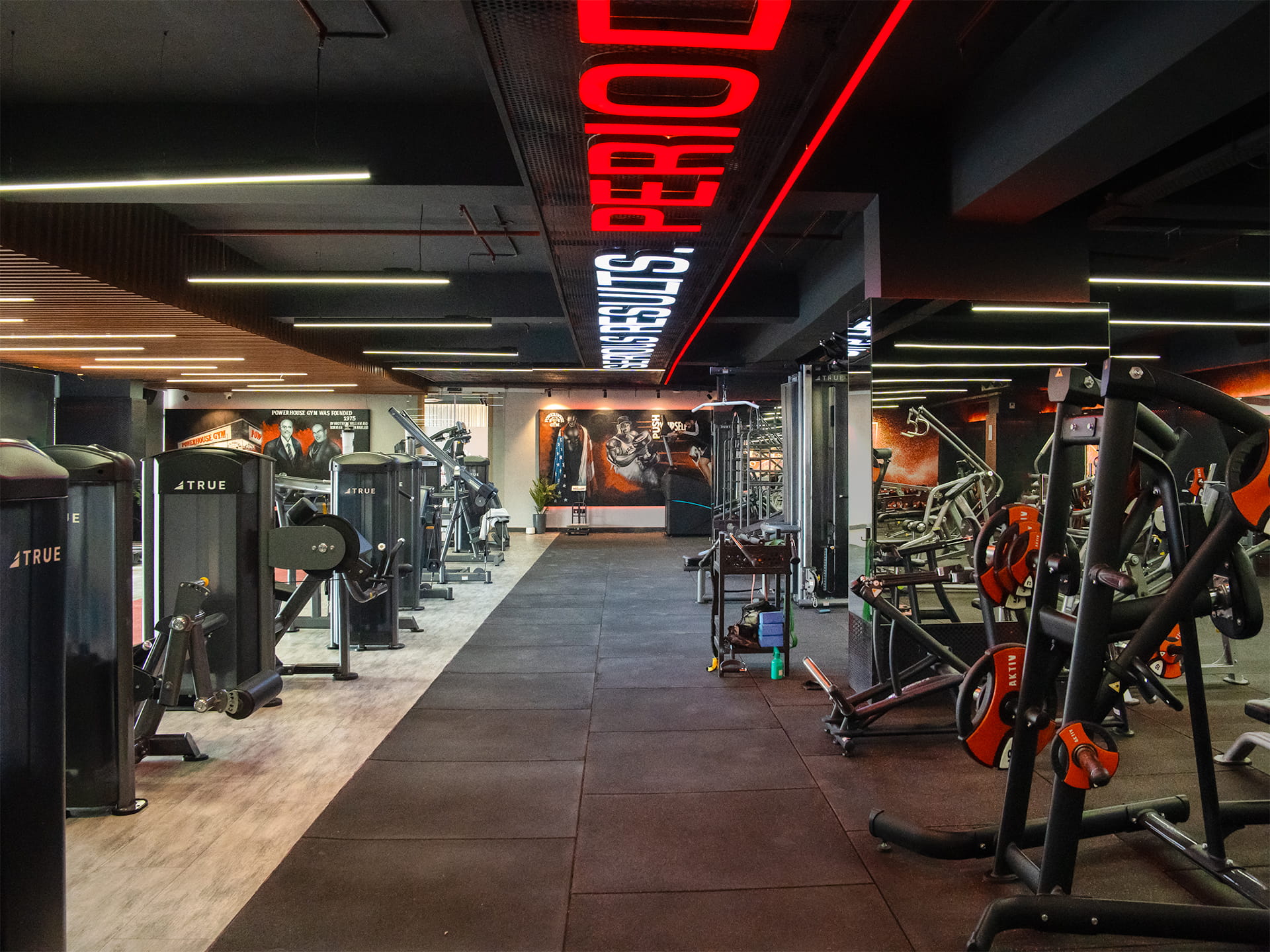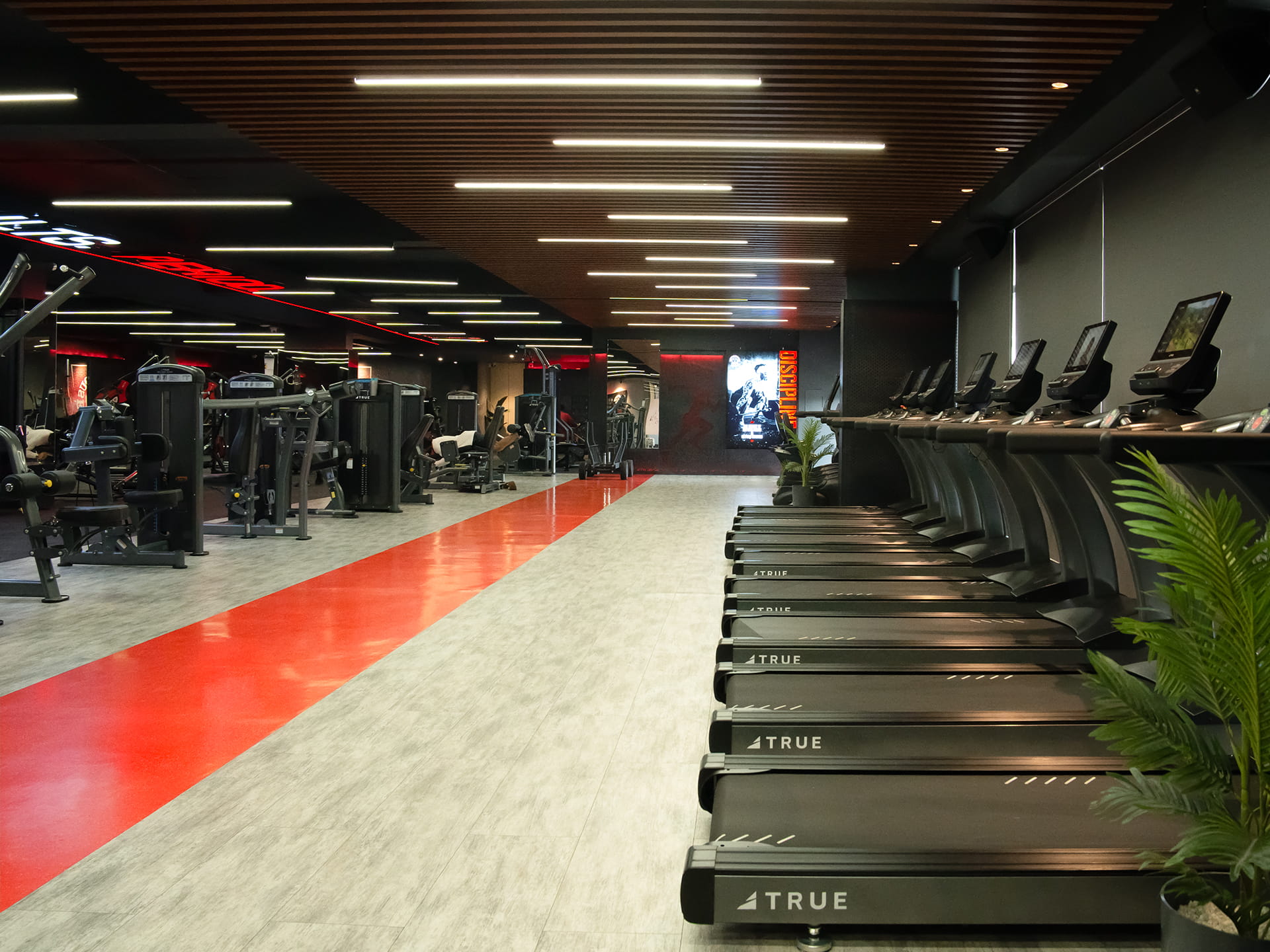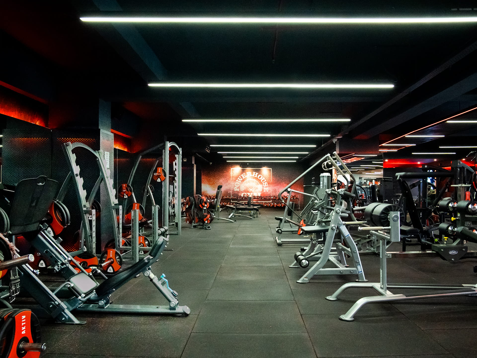 The 15,000 sq. ft. commercial gym in Mohali reflects the essence of powerhousegym through a bold yet minimalist design. Red accents energize the space, creating an atmosphere that sharpens focus and encourages movement. Every zone is thoughtfully designed to motivate, supporting a clear, determined fitness experience from the moment you enter.